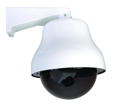 Flashing LED on camera (requires two "AA" batteries). This is the ideal deterrent camera and housing for your business or home. Measuring 12 inches at the dome base, and featuring a professionally painted and polished white ABS bell housing and smoked dome lens, you can't find a more authentic looking camera housing. Take advantage of economical dummy cameras when budgeting for your next CCTV installation.