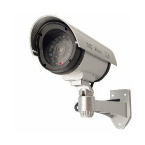 Now you can deter robbery, theft, and vandalism without the high cost of a real security camera. When placed in your home or business, even the most sophisticated criminals will think the premise is guarded by a high-tech surveillance system and go in search of an easier target. In fact, this is an actual surveillance camera that has been modified into a "dummy" or fake security camera. This unit does contain a flashing light. The camera features authentic video cable and a fully adjustable mounting bracket that will let you install the camera quickly and easily using the included stainless steel screws. Dimensions of the camera are 5 one half inches x 3 inches x 2 and one half inches (without rain shield). With the rain shield the dimensions increase to 7 x 3 x 3 inches. The camera requires 2 AA batteries that are not included.